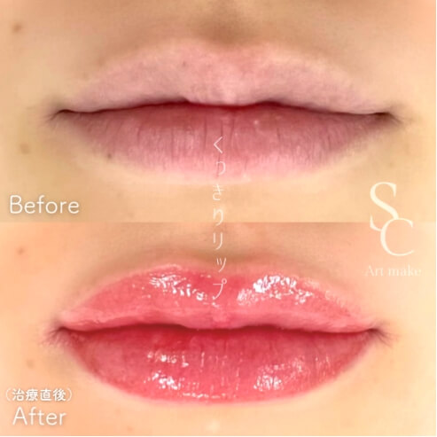 唇は目元と同様、お顔の印象を大きく左右します。リップアートメイクは、くすんだ唇に綺麗な血色感をもたせるだけでなく、唇の形もデザインすることが可能です。少しオーバー気味にリップラインを引くことで、ボリュームのあるふっくらとした唇にみせることができます。口角が上がったアヒル口のように見せることも可能です。